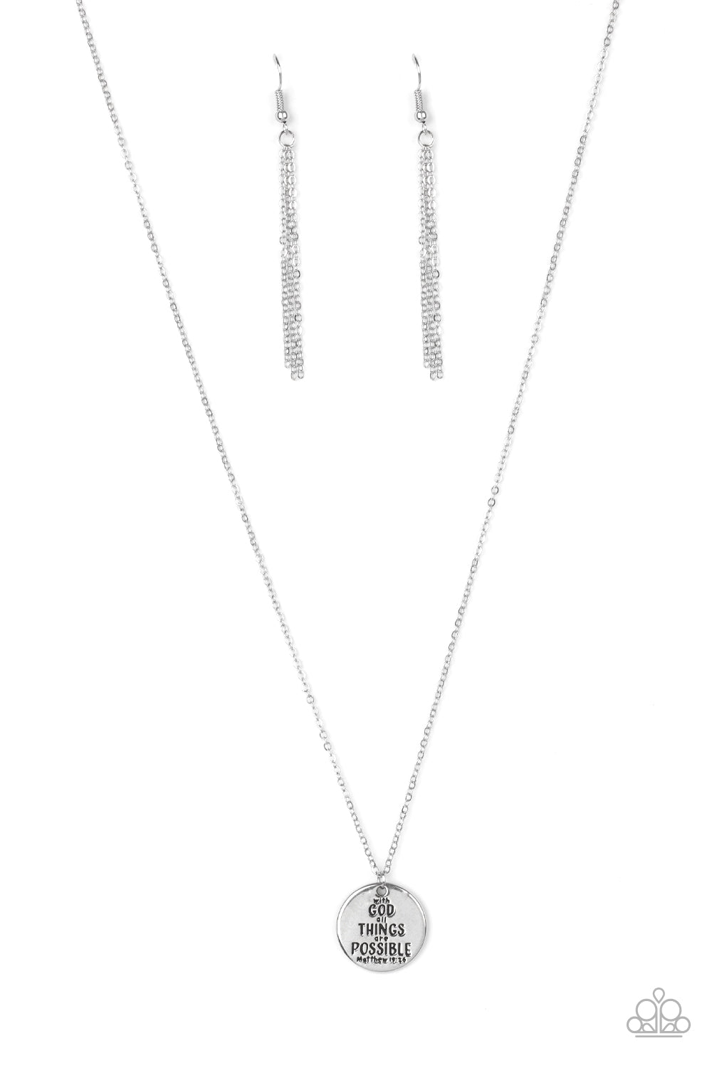 Brushed in a high sheen finish, a dainty silver pendant is stamped in the inspirational phrase, "With God All Things Are Possible, Matthew 19:26". Features an adjustable clasp closure.
