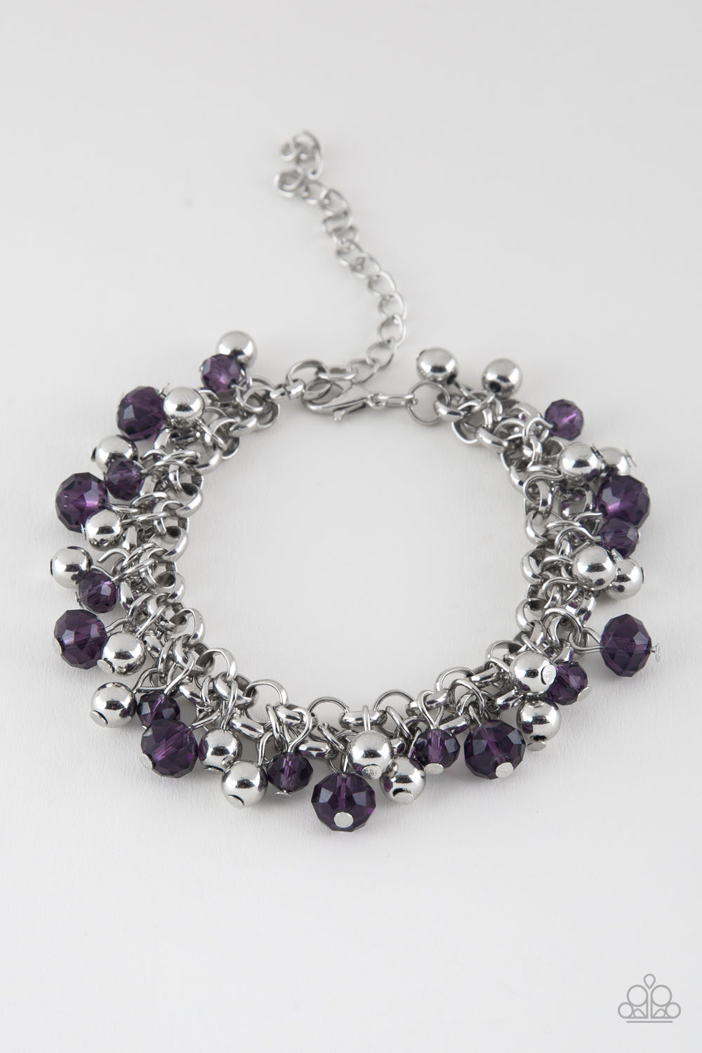 Faceted purple crystal-like beads and classic silver beads swing from interlocking silver chains, creating a refined fringe around the wrist. Features an adjustable clasp closure.