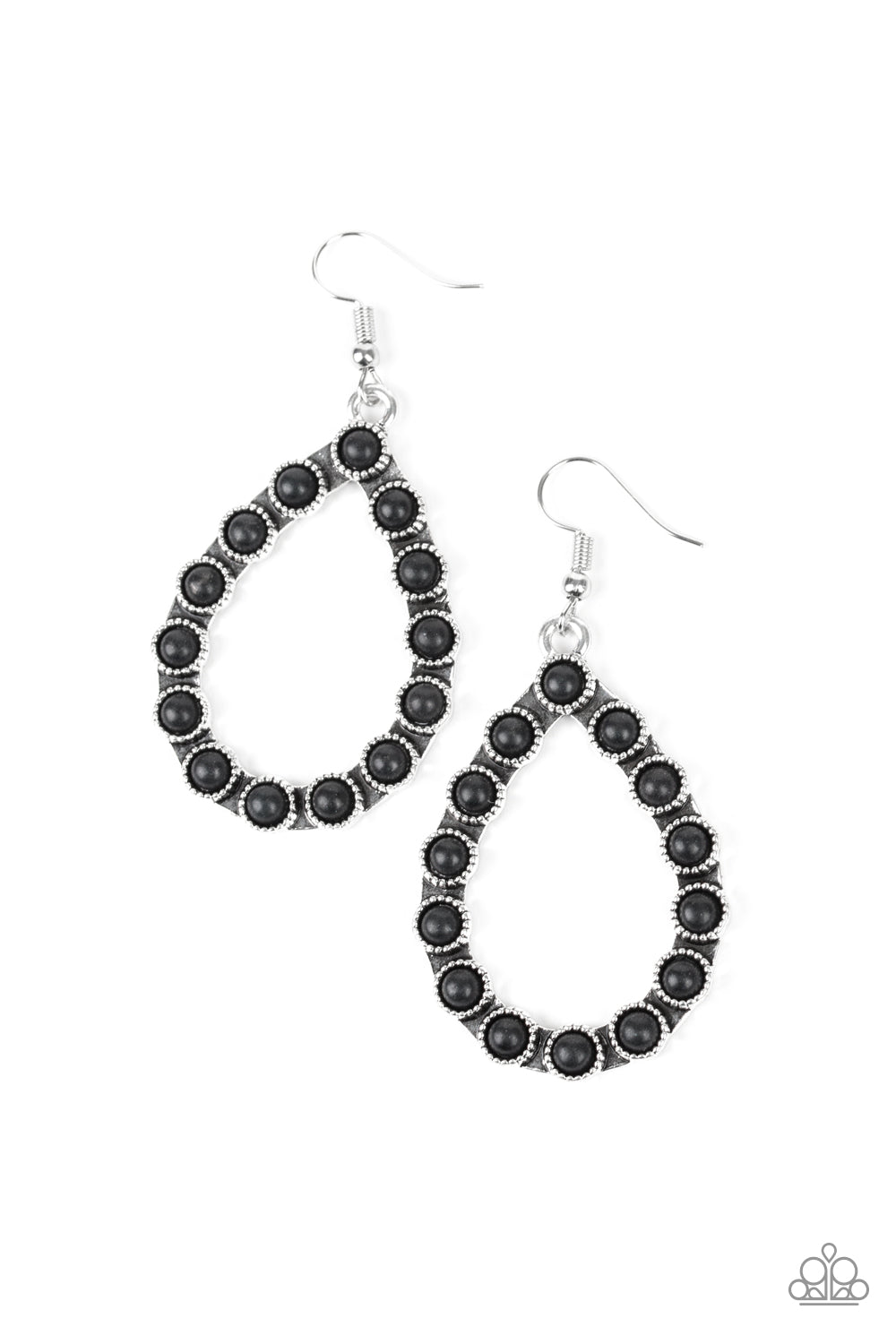 Dainty black stone beads are encrusted along the front of a shimmery silver teardrop, creating a seasonal lure. Earring attaches to a standard fishhook fitting.