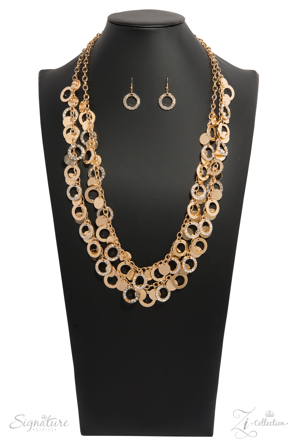A pair of long gold chains are decorated with countless gold hoops and discs, creating musical layers that cascade effortlessly down the chest. Some of the discs are etched with texture, while sparkling white rhinestones decorate several of the glistening gold rings scattered throughout the design, resulting in a flirtatious fringe adorned in mesmerizing sparkle. Features an adjustable clasp closure.