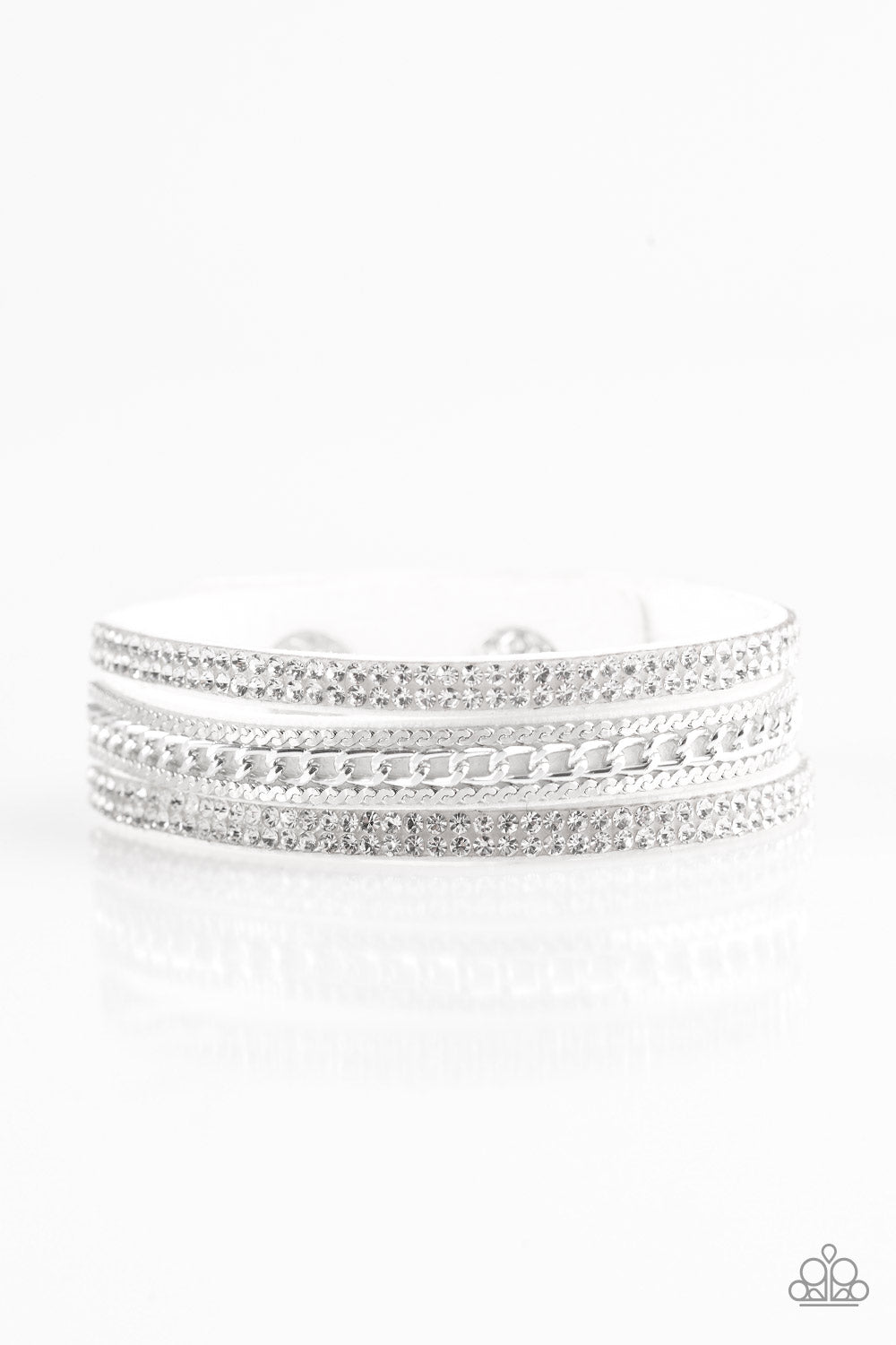 Glassy white rhinestones and shimmery silver chains are encrusted along strands of white suede, creating a mishmash of sassy shimmer around the wrist for a fierce look. Features an adjustable snap closure.