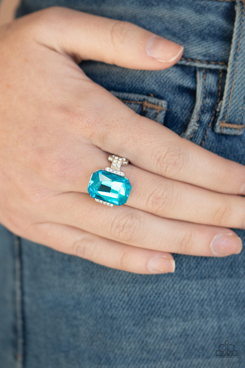Featuring a regal emerald cut, a dramatically oversized blue rhinestone is flanked by dainty silver frames encrusted in glassy white rhinestones for a refined flair. Features a stretchy band for a flexible fit.